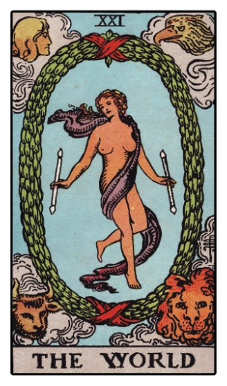 The World card marks the completion of a significant journey, symbolizing a deep sense of fulfillment and harmony. It is a card of unity, balance, and ultimate success, encouraging you to embrace your accomplishments and the wisdom gained along the way. With a wreath surrounding a dancing figure, it suggests movement and freedom as you step into a new phase of life with confidence. The figures in the corners represent the elements of the universe aligning in your favor. It’s a card of limitless possibilities and a celebration of wholeness.